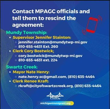 GENESEE COUNTY (CCN) — The Michigan Immigration Rights Center (MIRC) is urging residents in Mundy Township and the City of Swartz Creek to contact elected officials to protest an agreement allegedly reached by the Metro Police Authority with federal ICE agents.