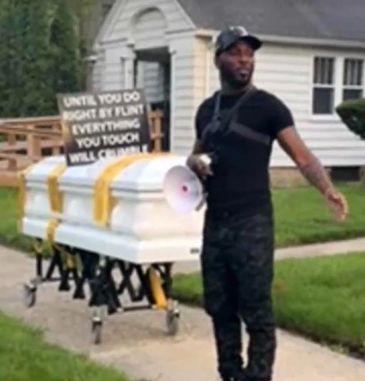 PHOTO CAPTION: Pictured above is national activist Jedidiah Brown during a Flint march with a casket. He is on bond in Flint after an arrest for the casket march. Widespread social media reports sayhe was arrested again this week in Harvey, Illinois where an altercation took place.